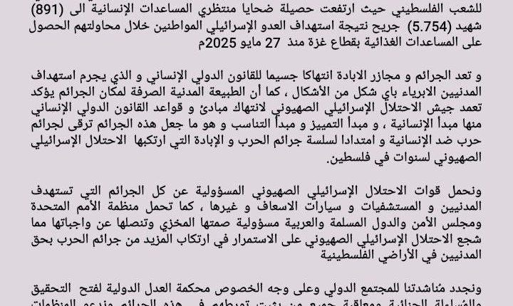ندين و نستنكر بأشد العبارات استمرار سلسلة جرائم عدوان الاحتلال الإسرائيلي الصهيوني للشعب الفلسطيني حيث ارتفعت حصيلة ضحايا منتظري المساعدات الإنسانية الى (891) شهيد و (5,754)جريح نتيجة استهداف العدو الإسرائيلي المواطنين خلال محاولتهم الحصول على المساعدات الغذائية بقطاع غزة منذ 27 مايو 2025م