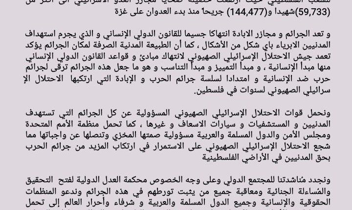 ندين و نستنكر بأشد العبارات استمرار سلسلة جرائم عدوان الاحتلال الإسرائيلي الصهيوني للشعب الفلسطيني حيث ارتفعت حصيلة ضحايا مجازر العدو الاسرائيلي الى اكثر من (59,733) شهيدا و (144,477)جريحاً منذ بدء العدوان على غزة