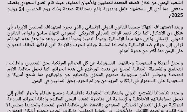 ندين ونستنكر بأشد العبارات استمرار جرائم و مجازر رتزقة تحالف العدوان الأمريكي السعودي بحق الشعب اليمني من خلال قصفه المتعمد للمدنيين والأعيان المدنية، حيث قام العدو السعودي بقصف مدفعي مما أدى الى استشهاد طفل بمديرية باقم بمحافظة صعدة وذلك يوم الخميس 24 يوليو 2025م