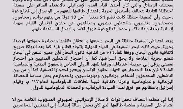 ندين و نستنكر بأشد العبارات استمرار سلسلة جرائم عدوان الاحتلال الإسرائيلي الصهيوني للشعب الفلسطيني ومحاولته فرض حصار مطبق على كل مصادر الحياة من غذاء وماء ودواء بمختلف الوسائل والتي كان أحدها قيام العدو الإسرائيلي بالاعتداء السافر على سفينة “حنظلة” التابعة لتحالف وأسطول الحرية واعتقال طاقمها لمنعهم من الوصول إلى قطاع غزة، حيث وأن السفينة حنظلة كانت تضم 21 مدنيا ًمن 12 دولة من بينهم نواب، ومحامون، وصحفيون، ونقابيون، وناشطون بيئيون، ومدافعون عن حقوق الإنسان للقيام بمهمة إنسانية بحتة و ذلك لكسر حصار قطاع غزة طويل الأمد و إيصال المساعدات لهم.