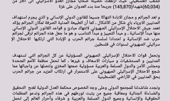 ونجدد مُناشدتنا للمجتمع الدولي وعلى وجه الخصوص محكمة العدل الدولية لفتح التحقيق والمُساءلة الجنائية ومعاقبة جميع من يثبت تورطهم في هذه الجرائم وندعو المنظمات الحقوقية والإنسانية وجميع الدول المسلمة والعربية و شرفاء وأحرار العالم إلى تحمل مسؤولياتهم الأخلاقية والإنسانية في مناصرة الشعب الفلسطيني المظلوم وإدانة الجرائم المروعة المرتكبة من قبل الاحتلال الإسرائيلي الصهيوني والضغط على منظمة الأمم المتحدة وتحديداً مجلس الأمن للقيام بواجبهم القانون والأخلاقي في حماية المدنيين وإيقاف هذا العدوان المتعمد