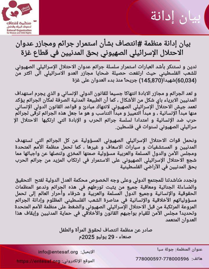 صادر عن منظمة انتصاف لحقوق المرأة والطفل