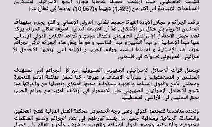 ونجدد مُناشدتنا للمجتمع الدولي وعلى وجه الخصوص محكمة العدل الدولية لفتح التحقيق والمُساءلة الجنائية ومعاقبة جميع من يثبت تورطهم في هذه الجرائم وندعو المنظمات الحقوقية والإنسانية وجميع الدول المسلمة والعربية و شرفاء وأحرار العالم إلى تحمل مسؤولياتهم الأخلاقية والإنسانية في مناصرة الشعب الفلسطيني المظلوم وإدانة الجرائم المروعة المرتكبة من قبل الاحتلال الإسرائيلي الصهيوني والضغط على منظمة الأمم المتحدة وتحديداً مجلس الأمن للقيام بواجبهم القانون والأخلاقي في حماية المدنيين وإيقاف هذا العدوان المتعمد