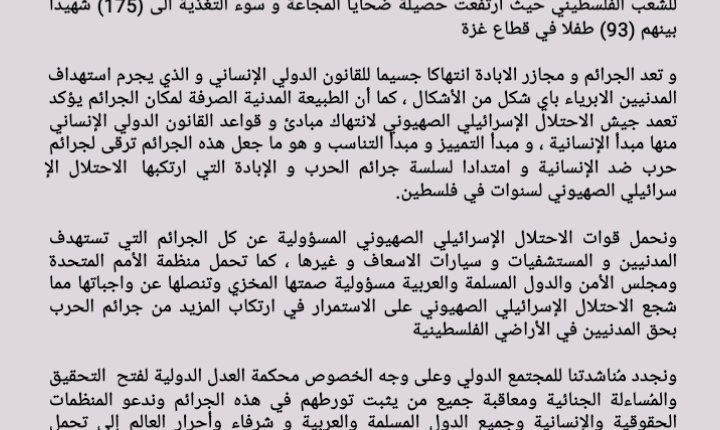 ونجدد مُناشدتنا للمجتمع الدولي وعلى وجه الخصوص محكمة العدل الدولية لفتح التحقيق والمُساءلة الجنائية ومعاقبة جميع من يثبت تورطهم في هذه الجرائم وندعو المنظمات الحقوقية والإنسانية وجميع الدول المسلمة والعربية و شرفاء وأحرار العالم إلى تحمل مسؤولياتهم الأخلاقية والإنسانية في مناصرة الشعب الفلسطيني المظلوم وإدانة الجرائم المروعة المرتكبة من قبل الاحتلال الإسرائيلي الصهيوني والضغط على منظمة الأمم المتحدة وتحديداً مجلس الأمن للقيام بواجبهم القانون والأخلاقي في حماية المدنيين وإيقاف هذا العدوان المتعمد