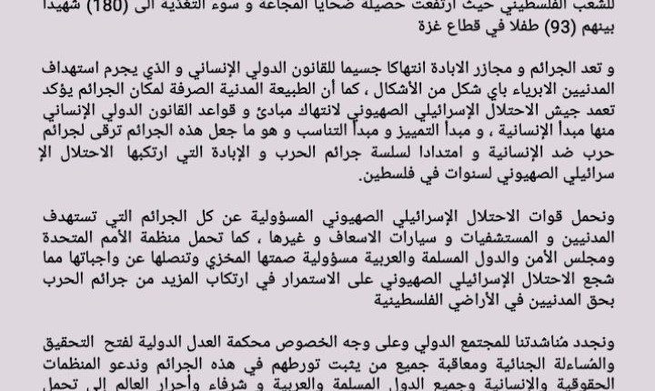 ونجدد مُناشدتنا للمجتمع الدولي وعلى وجه الخصوص محكمة العدل الدولية لفتح التحقيق والمُساءلة الجنائية ومعاقبة جميع من يثبت تورطهم في هذه الجرائم وندعو المنظمات الحقوقية والإنسانية وجميع الدول المسلمة والعربية و شرفاء وأحرار العالم إلى تحمل مسؤولياتهم الأخلاقية والإنسانية في مناصرة الشعب الفلسطيني المظلوم وإدانة الجرائم المروعة المرتكبة من قبل الاحتلال الإسرائيلي الصهيوني والضغط على منظمة الأمم المتحدة وتحديداً مجلس الأمن للقيام بواجبهم القانون والأخلاقي في حماية المدنيين وإيقاف هذا العدوان المتعمد