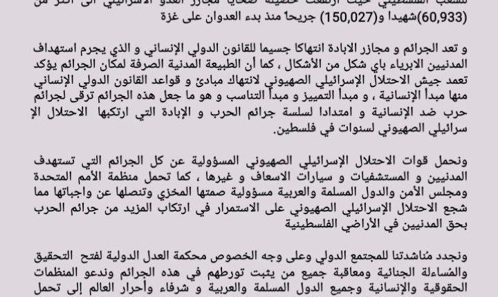 ندين و نستنكر بأشد العبارات استمرار سلسلة جرائم عدوان الاحتلال الإسرائيلي الصهيوني للشعب الفلسطيني حيث ارتفعت حصيلة ضحايا مجازر العدو الاسرائيلي الى اكثر من (60,933) شهيدا و (150,027)جريحاً منذ بدء العدوان على غزة