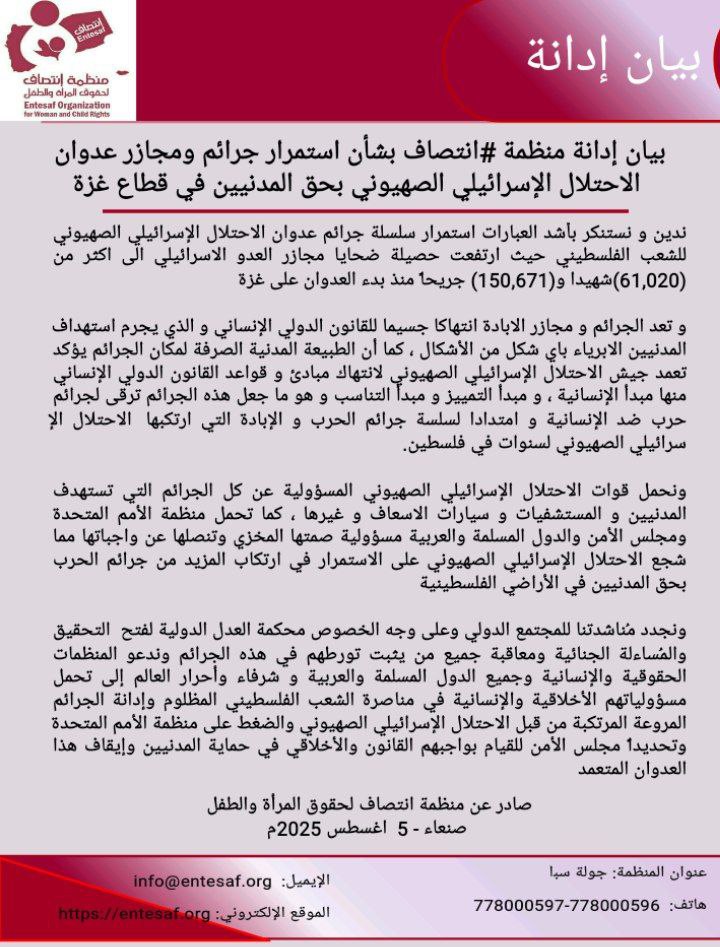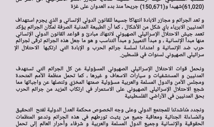 ندين و نستنكر بأشد العبارات استمرار سلسلة جرائم عدوان الاحتلال الإسرائيلي الصهيوني للشعب الفلسطيني حيث ارتفعت حصيلة ضحايا مجازر العدو الاسرائيلي الى اكثر من (61,020) شهيدا و (150,671)جريحاً منذ بدء العدوان على غزة