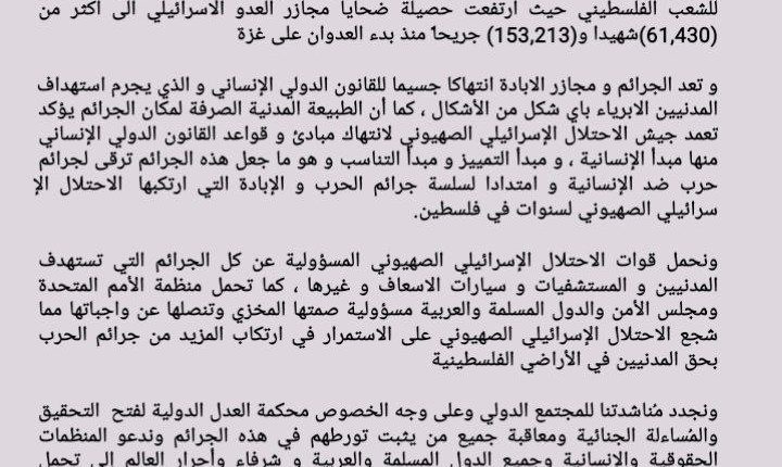 ندين و نستنكر بأشد العبارات استمرار سلسلة جرائم عدوان الاحتلال الإسرائيلي الصهيوني للشعب الفلسطيني حيث ارتفعت حصيلة ضحايا مجازر العدو الاسرائيلي الى اكثر من (61,430) شهيدا و (153,213)جريحاً منذ بدء العدوان على غزة