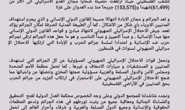 ندين و نستنكر بأشد العبارات استمرار سلسلة جرائم عدوان الاحتلال الإسرائيلي الصهيوني للشعب الفلسطيني حيث ارتفعت حصيلة ضحايا مجازر العدو الاسرائيلي الى اكثر من (61,499) شهيدا و (153,575)جريحاً منذ بدء العدوان على غزة