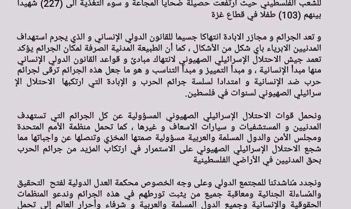 ونجدد مُناشدتنا للمجتمع الدولي وعلى وجه الخصوص محكمة العدل الدولية لفتح التحقيق والمُساءلة الجنائية ومعاقبة جميع من يثبت تورطهم في هذه الجرائم وندعو المنظمات الحقوقية والإنسانية وجميع الدول المسلمة والعربية و شرفاء وأحرار العالم إلى تحمل مسؤولياتهم الأخلاقية والإنسانية في مناصرة الشعب الفلسطيني المظلوم وإدانة الجرائم المروعة المرتكبة من قبل الاحتلال الإسرائيلي الصهيوني والضغط على منظمة الأمم المتحدة وتحديداً مجلس الأمن للقيام بواجبهم القانون والأخلاقي في حماية المدنيين وإيقاف هذا العدوان المتعمد