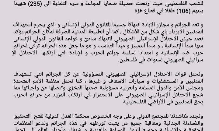 ونجدد مُناشدتنا للمجتمع الدولي وعلى وجه الخصوص محكمة العدل الدولية لفتح التحقيق والمُساءلة الجنائية ومعاقبة جميع من يثبت تورطهم في هذه الجرائم وندعو المنظمات الحقوقية والإنسانية وجميع الدول المسلمة والعربية و شرفاء وأحرار العالم إلى تحمل مسؤولياتهم الأخلاقية والإنسانية في مناصرة الشعب الفلسطيني المظلوم وإدانة الجرائم المروعة المرتكبة من قبل الاحتلال الإسرائيلي الصهيوني والضغط على منظمة الأمم المتحدة وتحديداً مجلس الأمن للقيام بواجبهم القانون والأخلاقي في حماية المدنيين وإيقاف هذا العدوان المتعمد