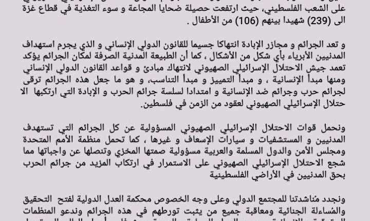 ونجدد مُناشدتنا للمجتمع الدولي وعلى وجه الخصوص محكمة العدل الدولية لفتح التحقيق والمُساءلة الجنائية ومعاقبة جميع من يثبت تورطهم في هذه الجرائم وندعو المنظمات الحقوقية والإنسانية وجميع الدول المسلمة والعربية و شرفاء وأحرار العالم إلى تحمل مسؤولياتهم الأخلاقية والإنسانية في مناصرة الشعب الفلسطيني المظلوم وإدانة الجرائم المروعة المرتكبة من قبل الاحتلال الإسرائيلي الصهيوني والضغط على منظمة الأمم المتحدة وتحديداً مجلس الأمن للقيام بواجبهم القانون والأخلاقي في حماية المدنيين وإيقاف هذا العدوان المتعمد على المدنيين في غزة.