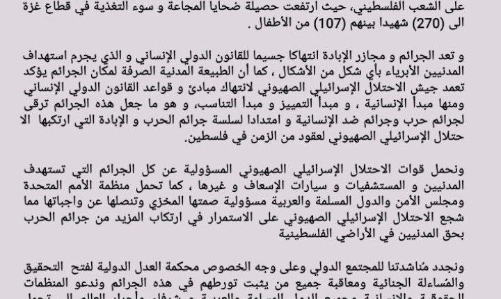 ونجدد مُناشدتنا للمجتمع الدولي وعلى وجه الخصوص محكمة العدل الدولية لفتح التحقيق والمُساءلة الجنائية ومعاقبة جميع من يثبت تورطهم في هذه الجرائم وندعو المنظمات الحقوقية والإنسانية وجميع الدول المسلمة والعربية و شرفاء وأحرار العالم إلى تحمل مسؤولياتهم الأخلاقية والإنسانية في مناصرة الشعب الفلسطيني المظلوم وإدانة الجرائم المروعة المرتكبة من قبل الاحتلال الإسرائيلي الصهيوني والضغط على منظمة الأمم المتحدة وتحديداً مجلس الأمن للقيام بواجبهم القانون والأخلاقي في حماية المدنيين وإيقاف هذا العدوان المتعمد على المدنيين في غزة.
