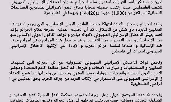ونجدد مُناشدتنا للمجتمع الدولي وعلى وجه الخصوص محكمة العدل الدولية لفتح التحقيق والمُساءلة الجنائية ومعاقبة جميع من يثبت تورطهم في هذه الجرائم وندعو المنظمات الحقوقية والإنسانية وجميع الدول المسلمة والعربية و شرفاء وأحرار العالم إلى تحمل مسؤولياتهم الأخلاقية والإنسانية في مناصرة الشعب الفلسطيني المظلوم وإدانة الجرائم المروعة المرتكبة من قبل الاحتلال الإسرائيلي الصهيوني والضغط على منظمة الأمم المتحدة وتحديداً مجلس الأمن للقيام بواجبهم القانون والأخلاقي في حماية المدنيين وإيقاف هذا العدوان المتعمد