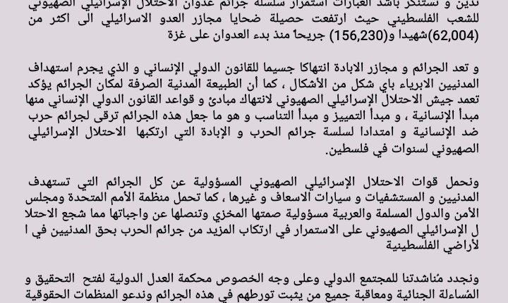 ندين و نستنكر بأشد العبارات استمرار سلسلة جرائم عدوان الاحتلال الإسرائيلي الصهيوني للشعب الفلسطيني حيث ارتفعت حصيلة ضحايا مجازر العدو الاسرائيلي الى اكثر من (62,004) شهيدا و (156,230)جريحاً منذ بدء العدوان على غزة