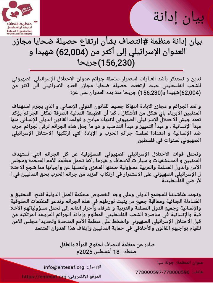 بيان إدانة منظمة #انتصاف بشأن ارتفاع حصيلة ضحايا مجازر العدوان الإسرائيلي إلى أكثر من (62,004) شهيدا و (156,230)جريحاً