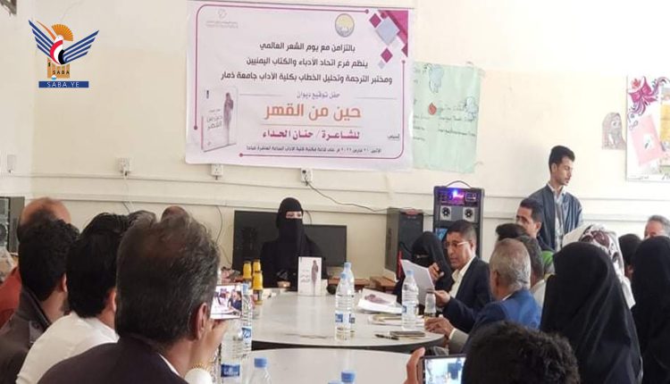 نظم فرع اتحاد الأدباء والكتاب ومختبر الترجمة وتحليل الخطاب بكلية الآداب جامعة ذمار اليوم حفل توقيع ديوان “حين من القهر” للشاعرة حنان الحداء، تزامنا مع اليوم العالمي للشعر.