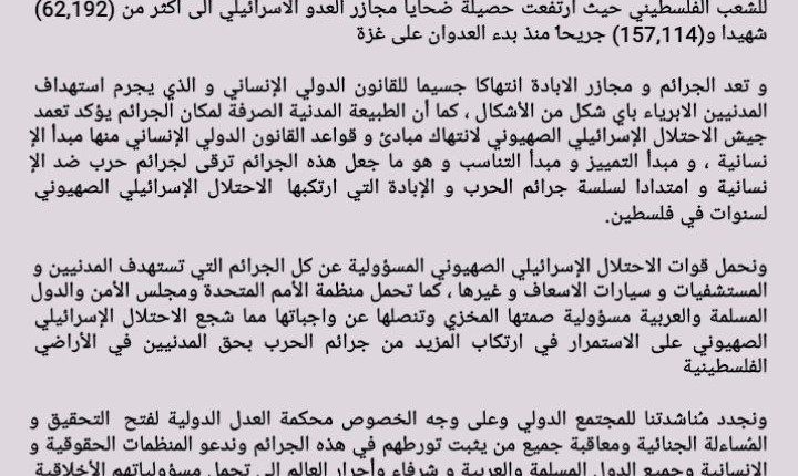 ندين و نستنكر بأشد العبارات استمرار سلسلة جرائم عدوان الاحتلال الإسرائيلي الصهيوني للشعب الفلسطيني حيث ارتفعت حصيلة ضحايا مجازر العدو الاسرائيلي الى اكثر من (62,192) شهيدا و (157,114)جريحاً منذ بدء العدوان على غزة