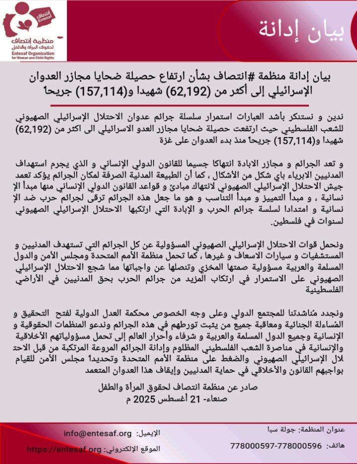 بيان إدانة منظمة #انتصاف بشأن ارتفاع حصيلة ضحايا مجازر العدوان الإسرائيلي إلى أكثر من (62,192) شهيدا و (157,114)جريحاً