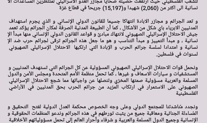 ونجدد مُناشدتنا للمجتمع الدولي وعلى وجه الخصوص محكمة العدل الدولية لفتح التحقيق والمُساءلة الجنائية ومعاقبة جميع من يثبت تورطهم في هذه الجرائم وندعو المنظمات الحقوقية والإنسانية وجميع الدول المسلمة والعربية و شرفاء وأحرار العالم إلى تحمل مسؤولياتهم الأخلاقية والإنسانية في مناصرة الشعب الفلسطيني المظلوم وإدانة الجرائم المروعة المرتكبة من قبل الاحتلال الإسرائيلي الصهيوني والضغط على منظمة الأمم المتحدة وتحديداً مجلس الأمن للقيام بواجبهم القانون والأخلاقي في حماية المدنيين وإيقاف هذا العدوان المتعمد
