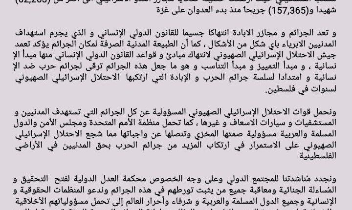 ندين و نستنكر بأشد العبارات استمرار سلسلة جرائم عدوان الاحتلال الإسرائيلي الصهيوني للشعب الفلسطيني حيث ارتفعت حصيلة ضحايا مجازر العدو الاسرائيلي الى اكثر من (62,263) شهيدا و (157,365)جريحاً منذ بدء العدوان على غزة