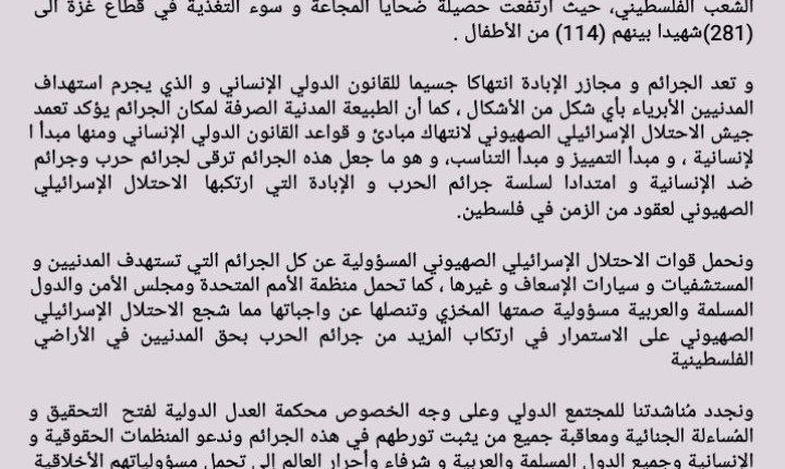 ونجدد مُناشدتنا للمجتمع الدولي وعلى وجه الخصوص محكمة العدل الدولية لفتح التحقيق والمُساءلة الجنائية ومعاقبة جميع من يثبت تورطهم في هذه الجرائم وندعو المنظمات الحقوقية والإنسانية وجميع الدول المسلمة والعربية و شرفاء وأحرار العالم إلى تحمل مسؤولياتهم الأخلاقية والإنسانية في مناصرة الشعب الفلسطيني المظلوم وإدانة الجرائم المروعة المرتكبة من قبل الاحتلال الإسرائيلي الصهيوني والضغط على منظمة الأمم المتحدة وتحديداً مجلس الأمن للقيام بواجبهم القانون والأخلاقي في حماية المدنيين وإيقاف هذا العدوان المتعمد على المدنيين في غزة.