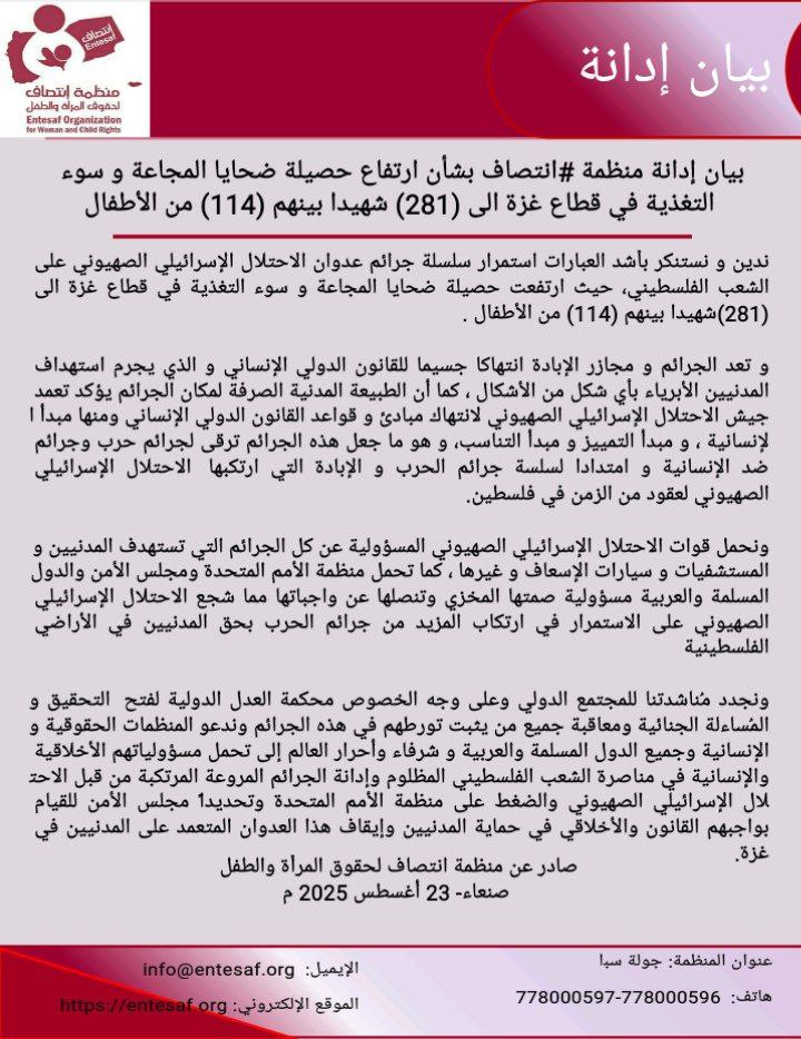 ندين و نستنكر بأشد العبارات استمرار سلسلة جرائم عدوان الاحتلال الإسرائيلي الصهيوني على الشعب الفلسطيني، حيث ارتفعت حصيلة ضحايا المجاعة و سوء التغذية في قطاع غزة الى (281) شهيدا بينهم (114) من الأطفال.