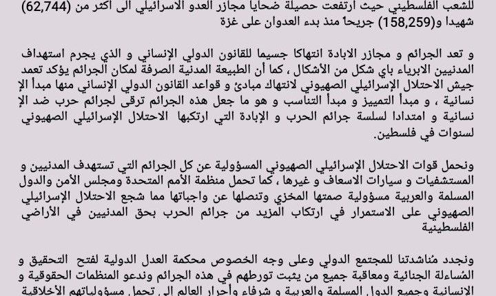 ندين و نستنكر بأشد العبارات استمرار سلسلة جرائم عدوان الاحتلال الإسرائيلي الصهيوني للشعب الفلسطيني حيث ارتفعت حصيلة ضحايا مجازر العدو الاسرائيلي الى اكثر من (62,744) شهيدا و (158,259)جريحاً منذ بدء العدوان على غزة