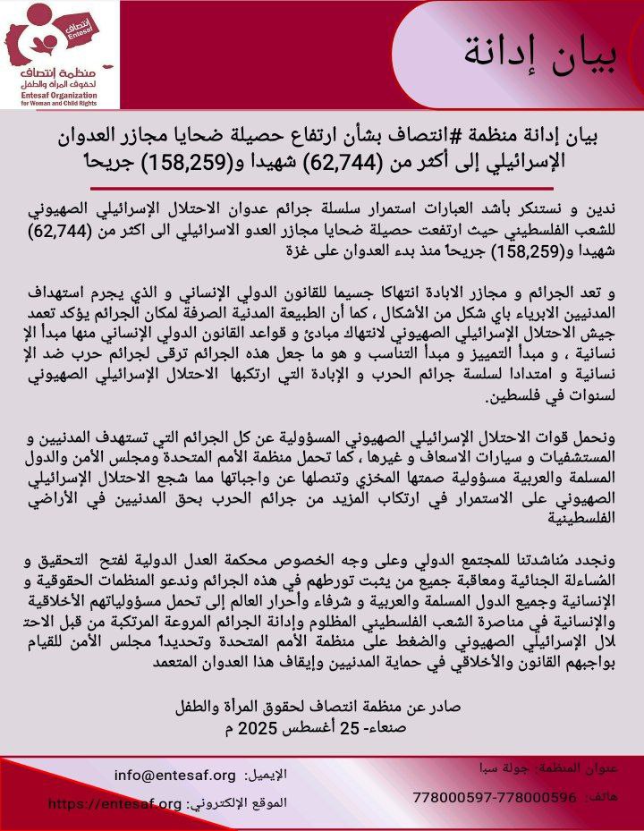 بيان إدانة منظمة #انتصاف بشأن ارتفاع حصيلة ضحايا مجازر العدوان الإسرائيلي إلى أكثر من (62,744) شهيدا و (158,259)جريحاً