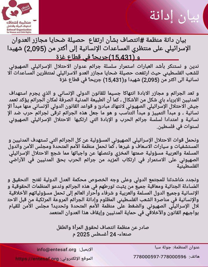 بيان إدانة منظمة #انتصاف بشأن ارتفاع حصيلة ضحايا مجازر العدوان الإسرائيلي على منتظري المساعدات الإنسانية إلى أكثر من (2,095) شهيدا و (15,431)جريحاً في قطاع غزة