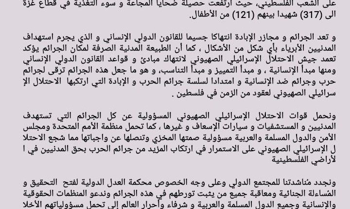 ونجدد مُناشدتنا للمجتمع الدولي وعلى وجه الخصوص محكمة العدل الدولية لفتح التحقيق والمُساءلة الجنائية ومعاقبة جميع من يثبت تورطهم في هذه الجرائم وندعو المنظمات الحقوقية والإنسانية وجميع الدول المسلمة والعربية و شرفاء وأحرار العالم إلى تحمل مسؤولياتهم الأخلاقية والإنسانية في مناصرة الشعب الفلسطيني المظلوم وإدانة الجرائم المروعة المرتكبة من قبل الاحتلال الإسرائيلي الصهيوني والضغط على منظمة الأمم المتحدة وتحديداً مجلس الأمن للقيام بواجبهم القانون والأخلاقي في حماية المدنيين وإيقاف هذا العدوان المتعمد على المدنيين في غزة.