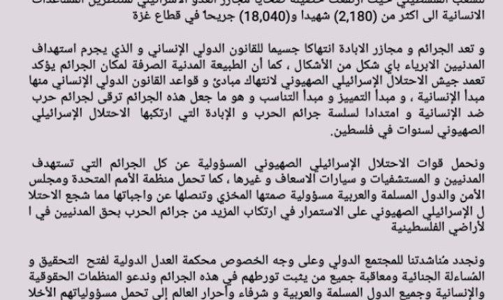 ونجدد مُناشدتنا للمجتمع الدولي وعلى وجه الخصوص محكمة العدل الدولية لفتح التحقيق والمُساءلة الجنائية ومعاقبة جميع من يثبت تورطهم في هذه الجرائم وندعو المنظمات الحقوقية والإنسانية وجميع الدول المسلمة والعربية و شرفاء وأحرار العالم إلى تحمل مسؤولياتهم الأخلاقية والإنسانية في مناصرة الشعب الفلسطيني المظلوم وإدانة الجرائم المروعة المرتكبة من قبل الاحتلال الإسرائيلي الصهيوني والضغط على منظمة الأمم المتحدة وتحديداً مجلس الأمن للقيام بواجبهم القانون والأخلاقي في حماية المدنيين وإيقاف هذا العدوان المتعمد
