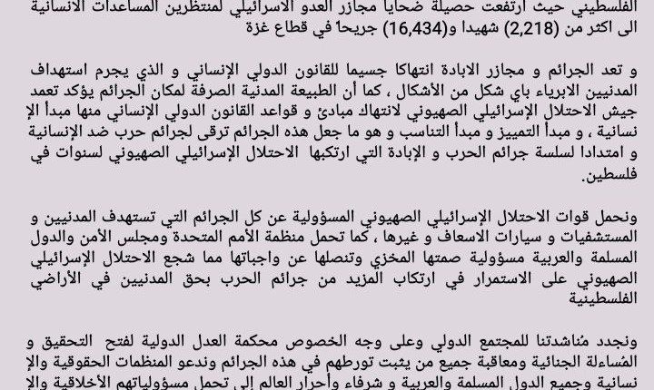 ونجدد مُناشدتنا للمجتمع الدولي وعلى وجه الخصوص محكمة العدل الدولية لفتح التحقيق والمُساءلة الجنائية ومعاقبة جميع من يثبت تورطهم في هذه الجرائم وندعو المنظمات الحقوقية والإنسانية وجميع الدول المسلمة والعربية و شرفاء وأحرار العالم إلى تحمل مسؤولياتهم الأخلاقية والإنسانية في مناصرة الشعب الفلسطيني المظلوم وإدانة الجرائم المروعة المرتكبة من قبل الاحتلال الإسرائيلي الصهيوني والضغط على منظمة الأمم المتحدة وتحديداً مجلس الأمن للقيام بواجبهم القانون والأخلاقي في حماية المدنيين وإيقاف هذا العدوان المتعمد