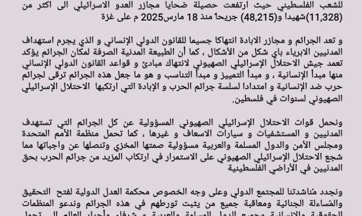 ندين و نستنكر بأشد العبارات استمرار سلسلة جرائم عدوان الاحتلال الإسرائيلي الصهيوني للشعب الفلسطيني حيث ارتفعت حصيلة ضحايا مجازر العدو الاسرائيلي الى اكثر من (11,328) شهيدا و (48,215)جريحاً منذ 18 مارس 2025م على غزة