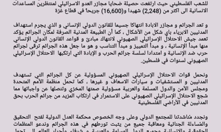 ونجدد مُناشدتنا للمجتمع الدولي وعلى وجه الخصوص محكمة العدل الدولية لفتح التحقيق والمُساءلة الجنائية ومعاقبة جميع من يثبت تورطهم في هذه الجرائم وندعو المنظمات الحقوقية والإنسانية وجميع الدول المسلمة والعربية و شرفاء وأحرار العالم إلى تحمل مسؤولياتهم الأخلاقية والإنسانية في مناصرة الشعب الفلسطيني المظلوم وإدانة الجرائم المروعة المرتكبة من قبل الاحتلال الإسرائيلي الصهيوني والضغط على منظمة الأمم المتحدة وتحديداً مجلس الأمن للقيام بواجبهم القانون والأخلاقي في حماية المدنيين وإيقاف هذا العدوان المتعمد