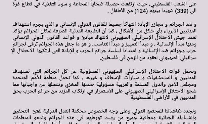 ونجدد مُناشدتنا للمجتمع الدولي وعلى وجه الخصوص محكمة العدل الدولية لفتح التحقيق والمُساءلة الجنائية ومعاقبة جميع من يثبت تورطهم في هذه الجرائم وندعو المنظمات الحقوقية والإنسانية وجميع الدول المسلمة والعربية و شرفاء وأحرار العالم إلى تحمل مسؤولياتهم الأخلاقية والإنسانية في مناصرة الشعب الفلسطيني المظلوم وإدانة الجرائم المروعة المرتكبة من قبل الاحتلال الإسرائيلي الصهيوني والضغط على منظمة الأمم المتحدة وتحديداً مجلس الأمن للقيام بواجبهم القانون والأخلاقي في حماية المدنيين وإيقاف هذا العدوان المتعمد على المدنيين في غزة.
