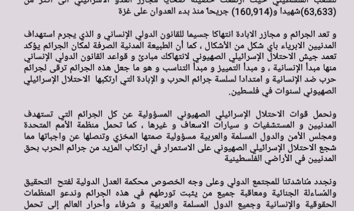 ندين و نستنكر بأشد العبارات استمرار سلسلة جرائم عدوان الاحتلال الإسرائيلي الصهيوني للشعب الفلسطيني حيث ارتفعت حصيلة ضحايا مجازر العدو الاسرائيلي الى اكثر من (63,633) شهيدا و (160,914)جريحاً منذ بدء العدوان على غزة