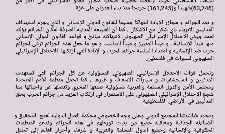 ندين و نستنكر بأشد العبارات استمرار سلسلة جرائم عدوان الاحتلال الإسرائيلي الصهيوني للشعب الفلسطيني حيث ارتفعت حصيلة ضحايا مجازر العدو الاسرائيلي الى اكثر من (63,746) شهيدا و (161,245)جريحاً منذ بدء العدوان على غزة