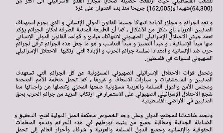 ندين و نستنكر بأشد العبارات استمرار سلسلة جرائم عدوان الاحتلال الإسرائيلي الصهيوني للشعب الفلسطيني حيث ارتفعت حصيلة ضحايا مجازر العدو الاسرائيلي الى اكثر من (64,300) شهيدا و (162,005)جريحاً منذ بدء العدوان على غزة