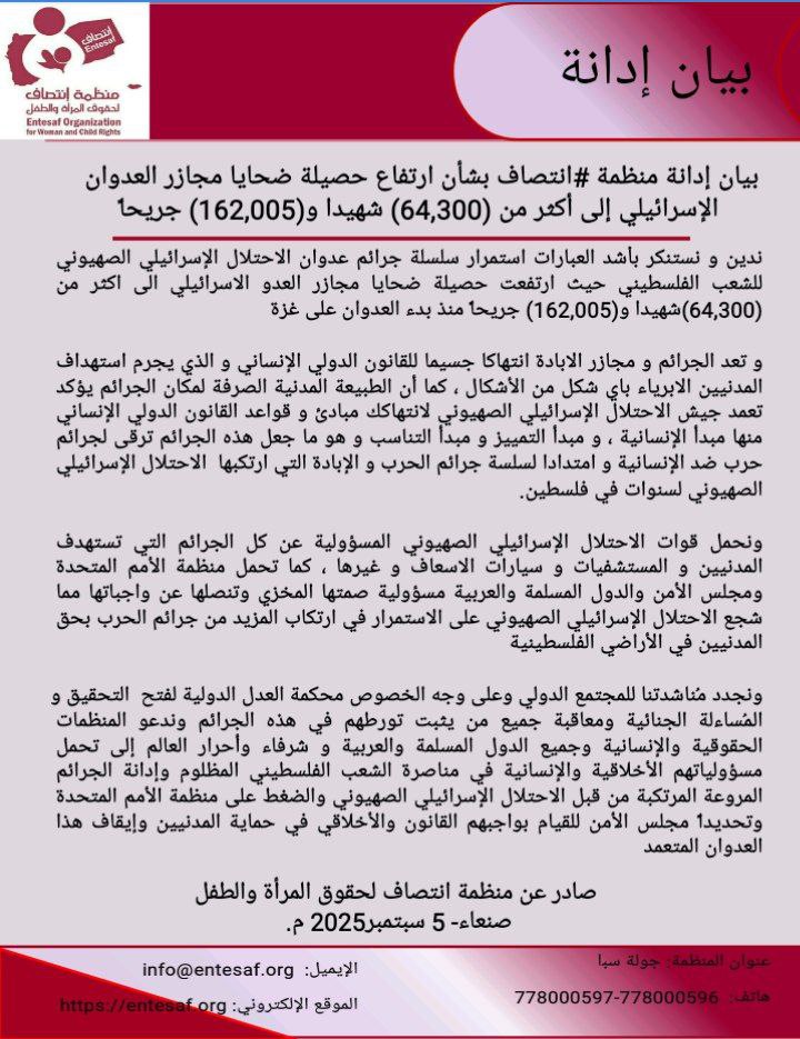 بيان إدانة منظمة #انتصاف بشأن ارتفاع حصيلة ضحايا مجازر العدوان الإسرائيلي إلى أكثر من (64,300) شهيدا و (162,005)جريحاً