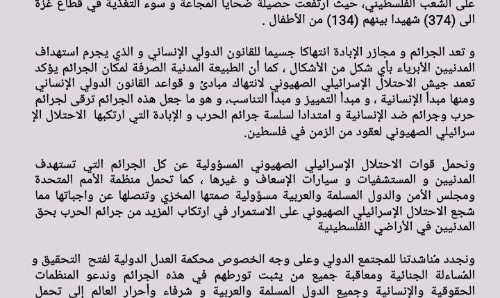 ونجدد مُناشدتنا للمجتمع الدولي وعلى وجه الخصوص محكمة العدل الدولية لفتح التحقيق والمُساءلة الجنائية ومعاقبة جميع من يثبت تورطهم في هذه الجرائم وندعو المنظمات الحقوقية والإنسانية وجميع الدول المسلمة والعربية و شرفاء وأحرار العالم إلى تحمل مسؤولياتهم الأخلاقية والإنسانية في مناصرة الشعب الفلسطيني المظلوم وإدانة الجرائم المروعة المرتكبة من قبل الاحتلال الإسرائيلي الصهيوني والضغط على منظمة الأمم المتحدة وتحديداً مجلس الأمن للقيام بواجبهم القانون والأخلاقي في حماية المدنيين وإيقاف هذا العدوان المتعمد على المدنيين في غزة.