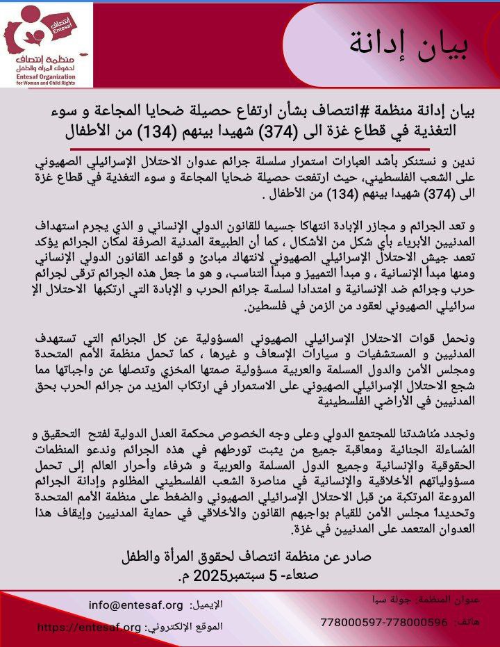 ندين و نستنكر بأشد العبارات استمرار سلسلة جرائم عدوان الاحتلال الإسرائيلي الصهيوني على الشعب الفلسطيني، حيث ارتفعت حصيلة ضحايا المجاعة و سوء التغذية في قطاع غزة الى (374) شهيدا بينهم (134) من الأطفال.