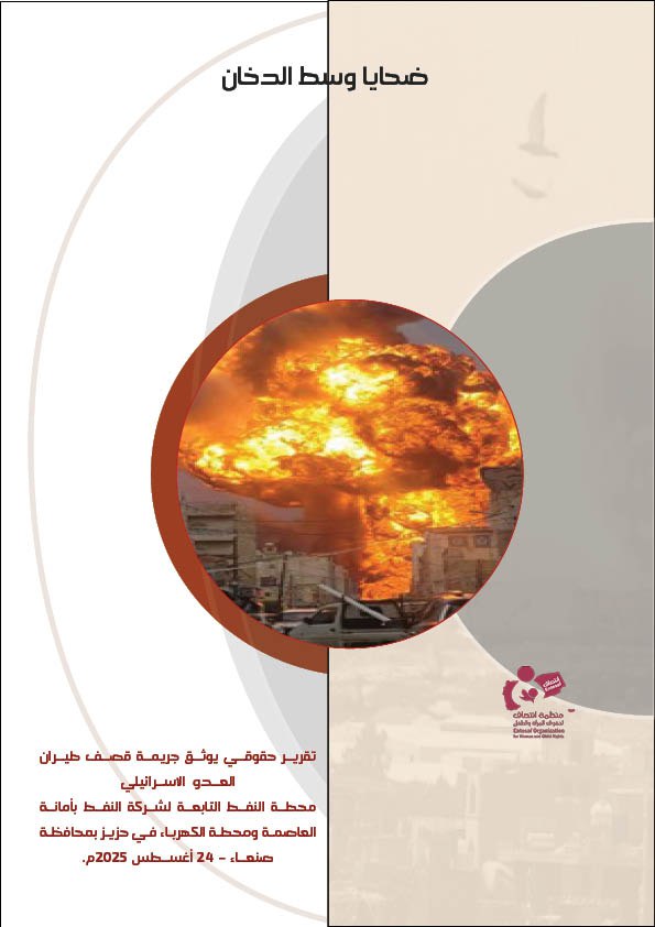 اصدرت منظمة انتصاف لحقوق المرأة والطفل تقريراً حقوقياً يوثق ” ضحايا وسط الدخان”حيث تناول التقرير جريمة قصف طيران العدو الأسرائيلي على محطة النفط التابعة لشركة النفط بأمانة العاصمة و محطة الكهرباء في حزيز بمحافظة صنعاء والتي راح ضحيتها مدنيين بينهم نساء و أطفال، وذلك بتاريخ 24 اغسطس 2025م