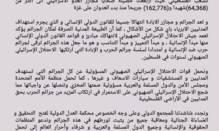 ندين و نستنكر بأشد العبارات استمرار سلسلة جرائم عدوان الاحتلال الإسرائيلي الصهيوني للشعب الفلسطيني حيث ارتفعت حصيلة ضحايا مجازر العدو الاسرائيلي الى اكثر من (64,368) شهيدا و (162,776)جريحاً منذ بدء العدوان على غزة
