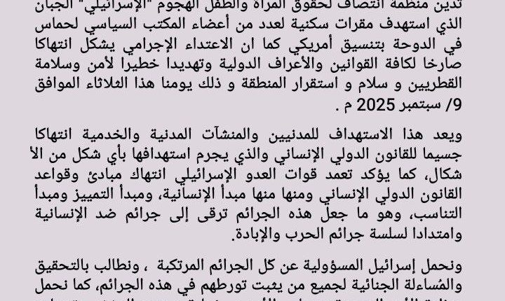 بيان إدانة منظمة #انتصاف بشأن استهداف العدوان الإسرائيلي دولة قطر الشقيقة واستهداف مقرات لعدد من أعضاء المكتب السياسي لحماس في #الدوحة بتنسيق أمريكي