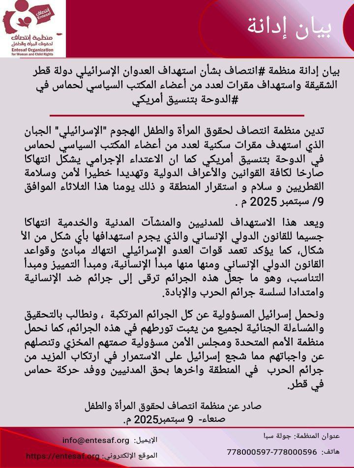 تدين منظمة انتصاف لحقوق المرأة والطفل الهجوم “الإسرائيلي” الجبان الذي استهدف مقرات سكنية لعدد من أعضاء المكتب السياسي لحماس في الدوحة بتنسيق أمريكي كما ان الاعتداء الإجرامي يشكل انتهاكا صارخا لكافة القوانين والأعراف الدولية وتهديدا خطيرا لأمن وسلامة القطريين