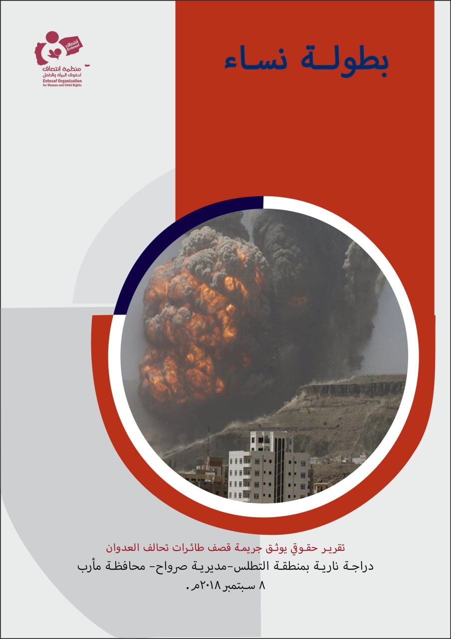 اصدرت منظمة انتصاف لحقوق المرأة والطفل تقريراً حقوقياً بعنوان “بطولة نساء” حيث تناول التقرير جريمة قصف طيران تحالف العدوان على دراجة نارية بمنطقة التطلس بمديرية صرواح التابعة لمحافظة مأرب والتي راح ضحيتها مدنيين بينهم نساء و أطفال، وذلك بتاريخ 8 سبتمبر 2018م