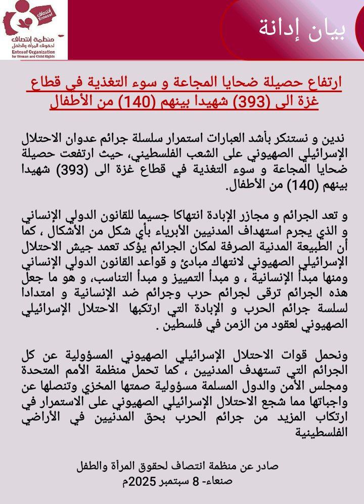 ندين و نستنكر بأشد العبارات استمرار سلسلة جرائم عدوان الاحتلال الإسرائيلي الصهيوني على الشعب الفلسطيني، حيث ارتفعت حصيلة ضحايا المجاعة و سوء التغذية في قطاع غزة الى (393) شهيدا بينهم (140) من الأطفال.