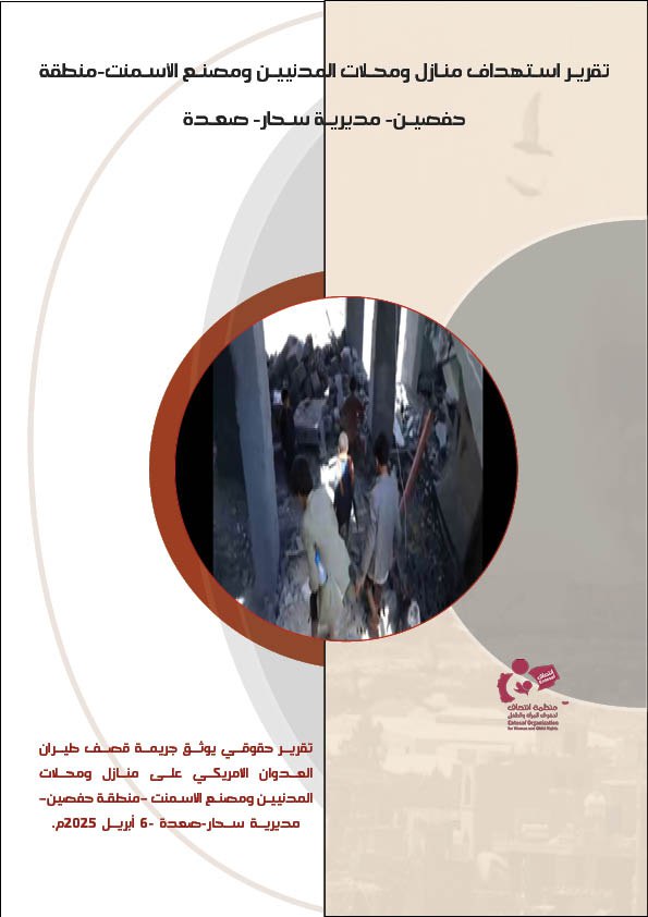 اصدرت منظمة انتصاف لحقوق المرأة والطفل تقريراً حقوقياً بعنوان “تقرير استهداف منازل و محلات المدنيين و مصنع الاسمنت بمنطقة حفصين مديرية سحار – صعدة” حيث تناول التقرير جريمة قصف طيران العدوان الامريكي على منازل و محلات المدنيين و مصنع الاسمنت بمنطقة حفصين بمديرية سحار التابعة لمحافظة صعدة والتي راح ضحيتها مدنيين بينهم نساء و أطفال، وذلك بتاريخ 6 أبريل 2025م
