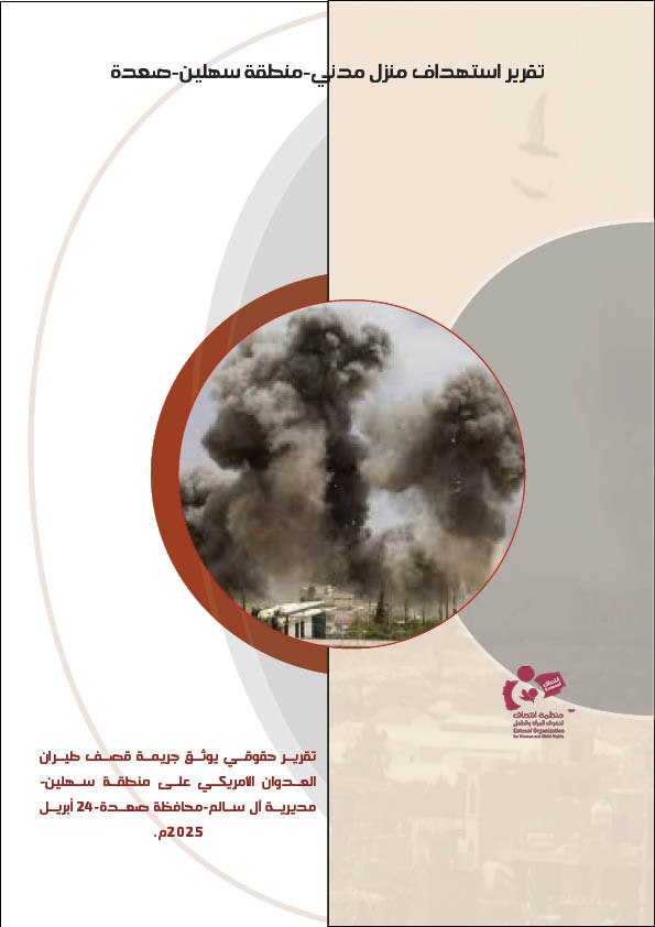 اصدرت منظمة انتصاف لحقوق المرأة والطفل تقريراً حقوقياً بعنوان “تقرير استهداف منزل مدني بمنطقة سهلين صعدة” حيث تناول التقرير جريمة قصف طيران العدوان الامريكي على منطقة سهلين بمديرية آل سالم التابعة لمحافظة صعدة والتي راح ضحيتها مدنيين بينهم نساء و أطفال، وذلك بتاريخ 24 أبريل 2025م